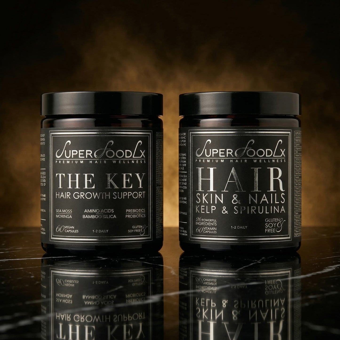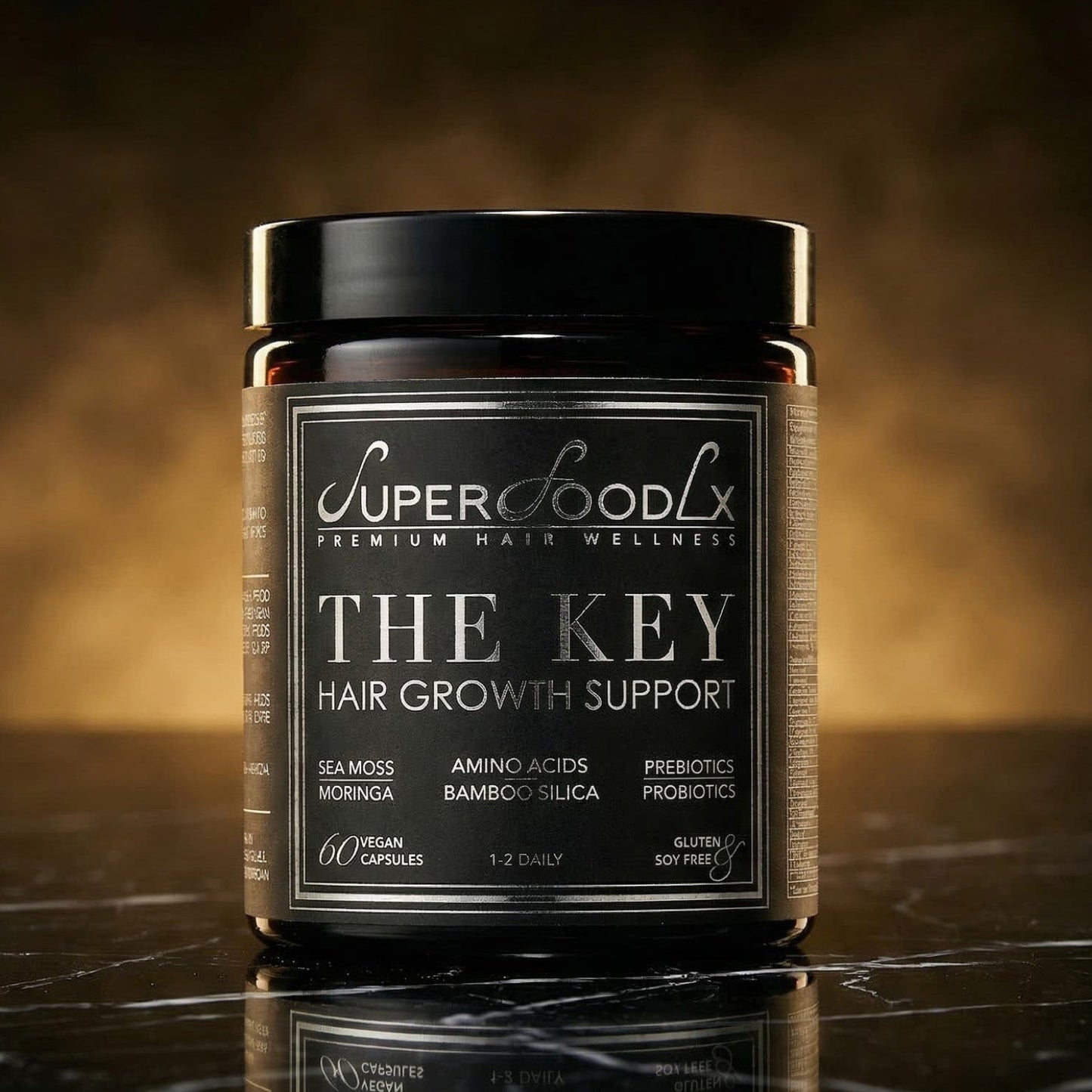 Our Hair Skin and Nails nutrient concentrate paired with The Key seamoss, moringa and probiotic complex supports; gut health, hormone health and works to satisfy nutrient gaps for stronger, faster hair growth.